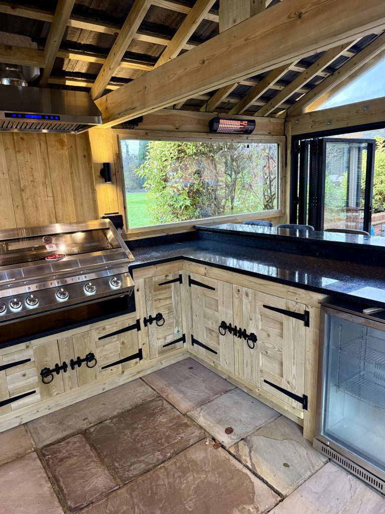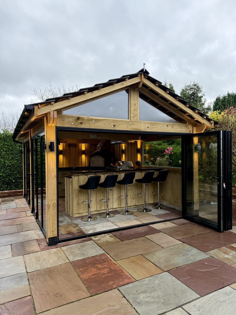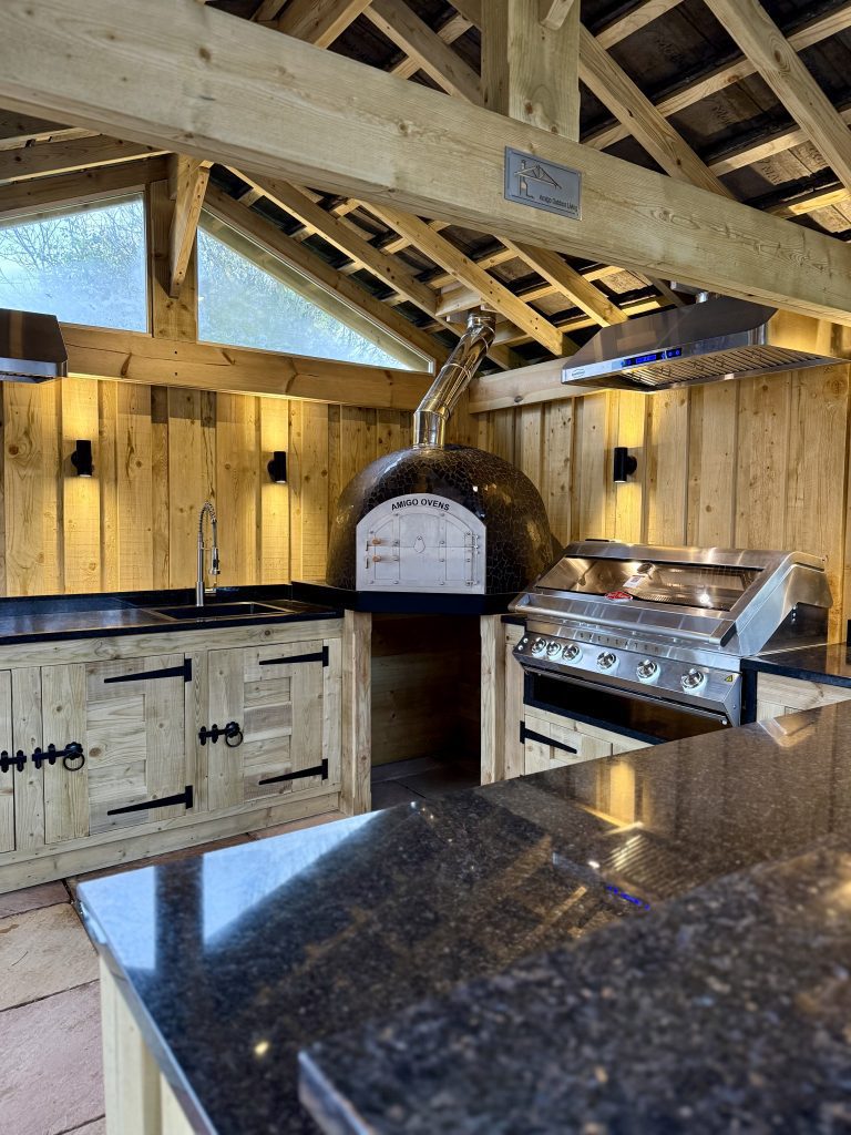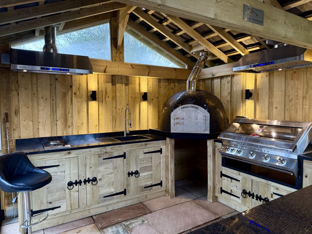 This recently completed outdoor kitchen barn blends traditional charm with practical, high-quality features. Designed for relaxed outdoor living, the space includes triple bi-fold doors allowing the area to be fully opened up during the warmer months or enclosed for the comfort when the weather turns.